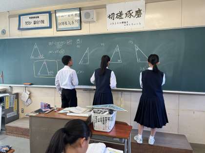 10月10日(木) 授業の様子 公開日 2024/10/10 更新日 2024/10/10 学び合い認め合う学習 今日も生徒たちは授業に一生懸命に取り組んでいます。 中間考査も近づいてきました。 新人大会もありますが、しっかり学習していきましょう! 写真は右から1年生家庭科、2年生数学、3年生理科の様子です。