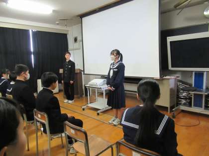 本日6限に2学期を振り返る学年集会を行いました。学年生徒会から2学期の活動の反省や学級の成長した点や課題を発表しました。また、写真を見ながら2学期の行事をみんなで振り返りました。今年も残りわずかです。良い新年を迎えられるように、今年を良い形で締めくくりましょう。