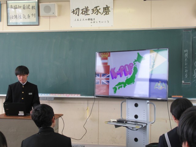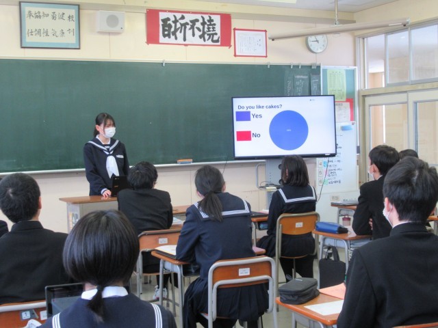 本日英語のスピーチ発表をしました。12月から準備してきたアンケート結果をまとめ、その結果をスライドを使いながら英語で説明しました。ジェスチャーやアイコンタクトを意識し、表情豊かに発表していて、スライドの内容も濃く、さすが2年生!だと思いました。