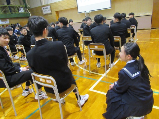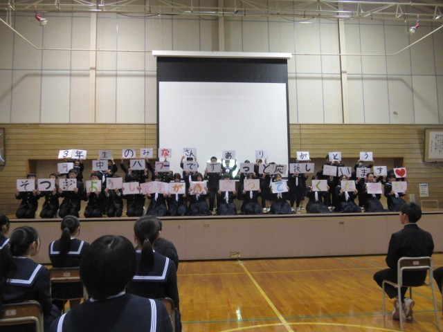 本日5,6限に「3年生を送る会」をしました。この日のために1,2年生はたくさん準備をしてきました。3年生は笑っている人も泣いている人もいて中学校での最後の時間をとても楽しんでいる様子でした。