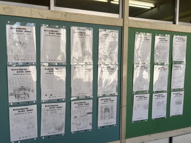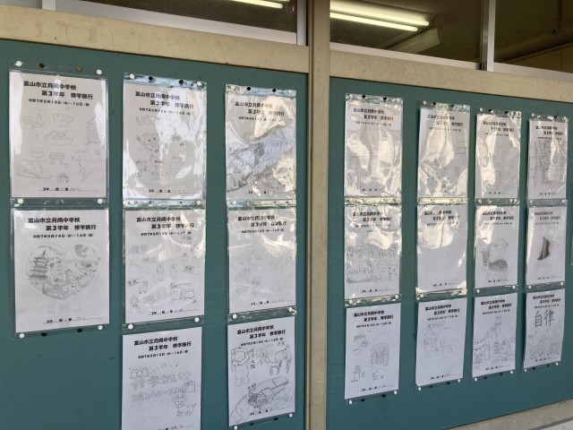 2年生は、自己紹介カード、3年生は修学旅行のしおり表紙を掲示しています。どれも丁寧に描かれています。