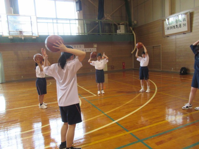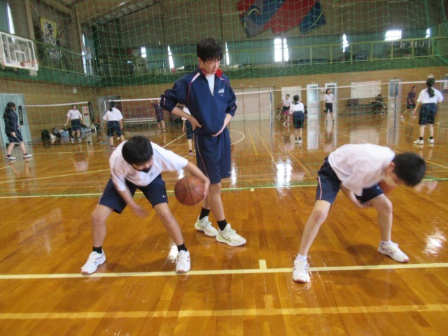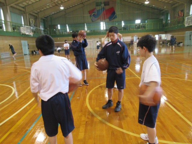 1年生が部活動体験に来ています。男女バスケットボール部の様子です。