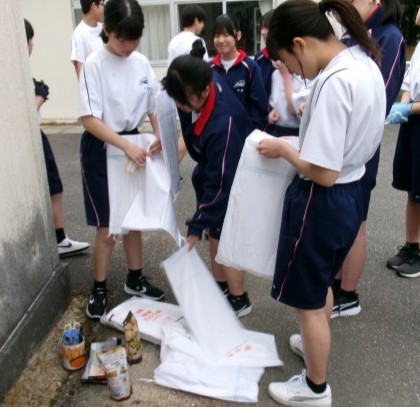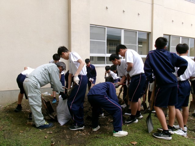 技術・家庭科の技術分野の授業の様子です。今日は、ジャガイモを植えました。用務員さんから手ほどきを受けて土嚢袋に土を入れていました。