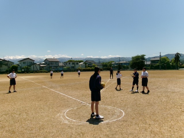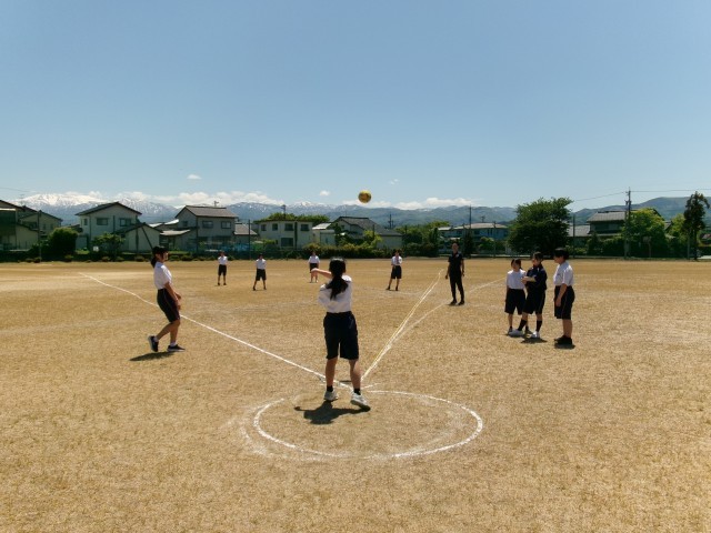 保健体育科の授業の様子です。ハンドボール投げの計測でした。小学生までは、ソフトボール投げだったので少し勝手が違うようですが、記録・ボール拾い・練習と役割分担をして計測していました。