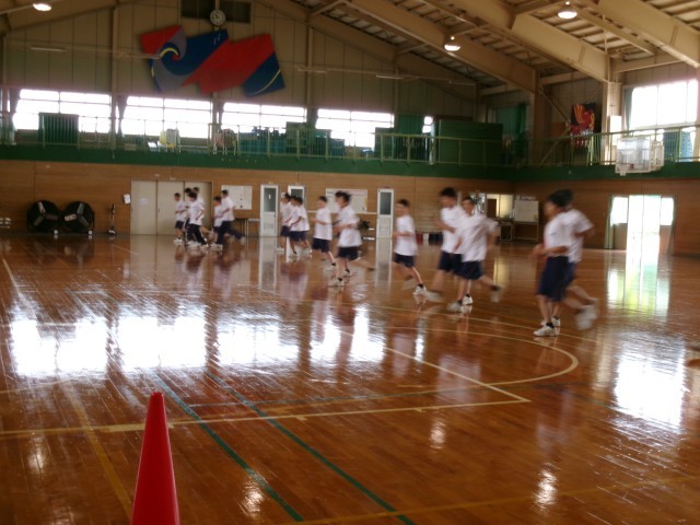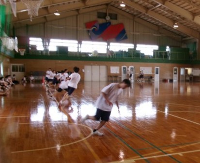 保健体育科の授業の様子です。スポーツテスト(新体力テスト)のシャトルランの計測中でした。今日は、走りやすい気温でしたが、熱がこもらないよう体育服の裾は短パンの外に出しています。2枚目の写真は、次のターンが100回のところです。応援の声もあり、なお頑張ることができたようです。
