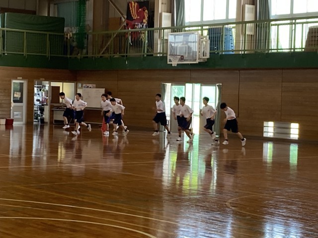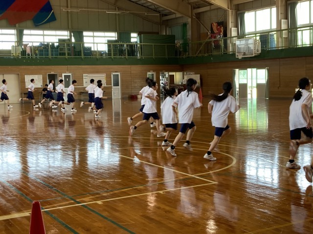 保健体育科の授業の様子です。スポーツテストのシャトルラン計測中でした。熱がこもらないよう体育服の裾を出していいよと指示がありました。そのとおりにする女子と、しっかり短パンに裾を入れている男子の違いがありました。「頑張れ~」と応援の声も多くあり、よい雰囲気の中で走っていました。
