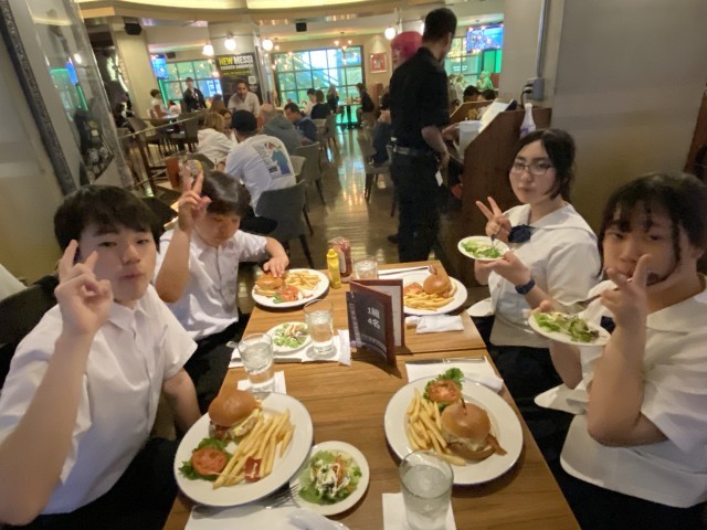 夕食は、ハンバーガーセットです。たくさん歩いて、たくさん食べて、健康的です。