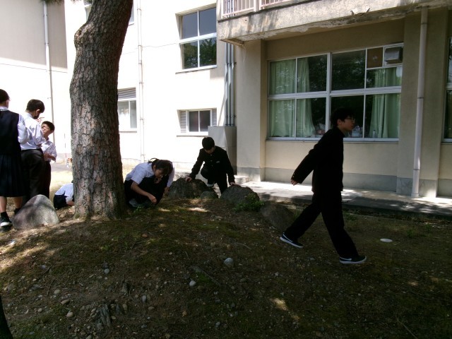理科の授業の様子です。松の種子を探しにちょうど外に出たところでした。意外に風が涼しいねと言いながら、探していました。なかなか「あった!」の声は聞けませんでしたが、この後ちゃんと見付けることができたそうです。