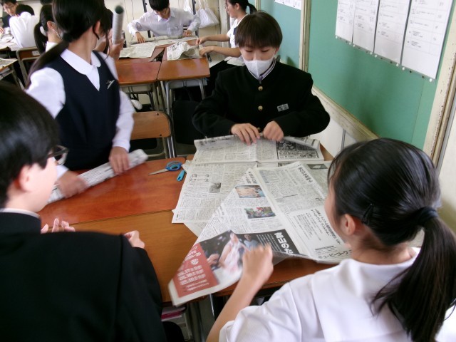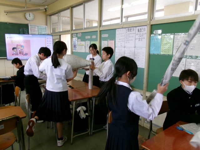 「新聞タワー」に挑戦していました。班のチームワークとアイディアが大切です。「はやく」つくりたい人と「慎重に」つくりたい人が声を掛け合いながら、作成していました。他の班を見て、「ああすれば、いいんだ!」と新たな発見も!楽しそうに取り組んでいました。