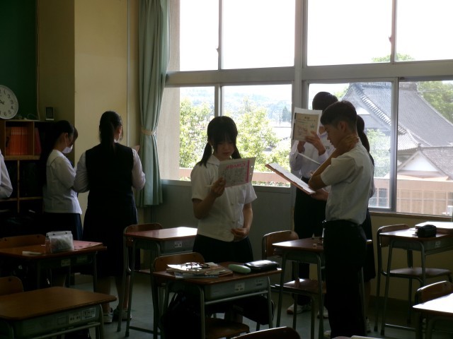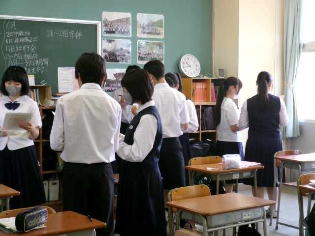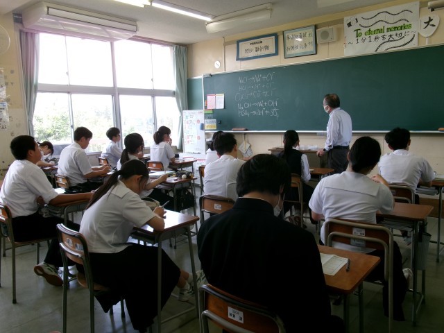 英語と理科の授業の様子です。英語は、例文を使って多くの人と会話をしていました。英語を話す体験は重要ですね。理科は、電離をあらわす式を学習中でした。イオンのプラスやマイナスの理屈が分かると楽しくなりますね。