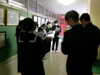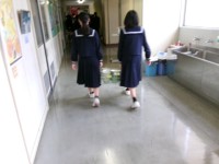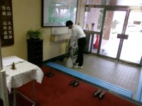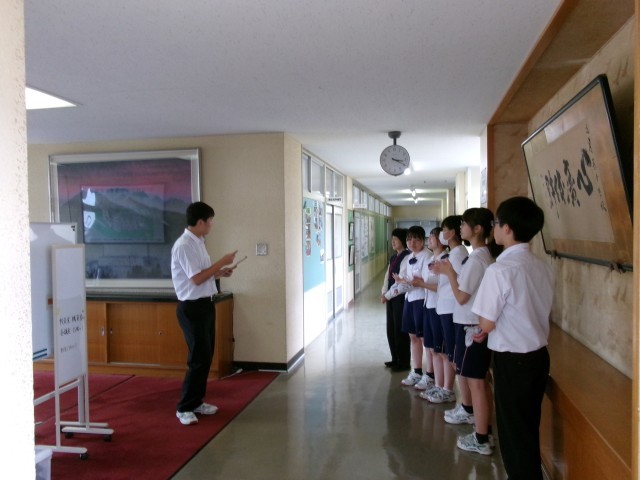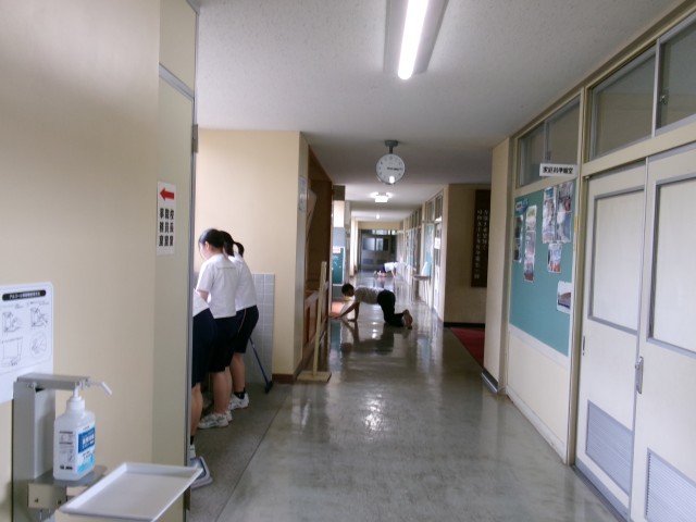 1階正面玄関前廊下清掃の様子です。反省会では、各自が気付いて清掃したことを述べ、聴いたみんなは、拍手をします。今日もきれいに掃除をしてくれてありがとうございます。