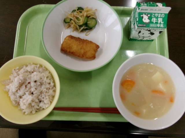学校給食では、6月を「かみかみ月間」としています。今年度は「カルシウムをとろう」「よくかんで食べよう」がテーマに献立実施されます。今日はかみごたえのある食材「雑穀」「いか」「すいとん」が使われています。いつもより多めにかんで、美味しくいただきました。