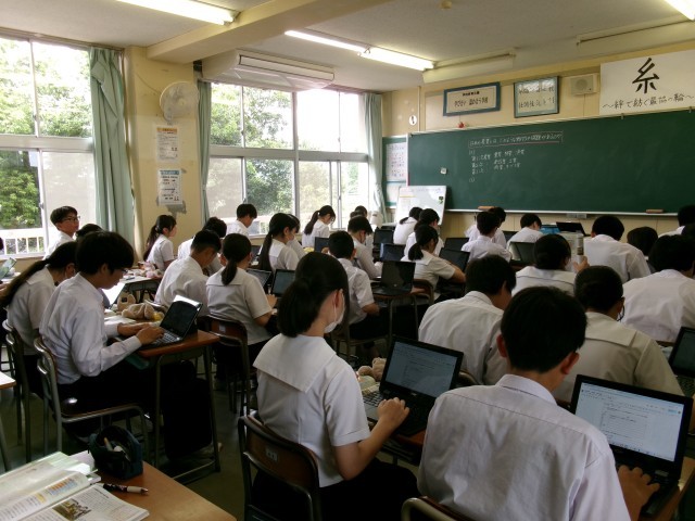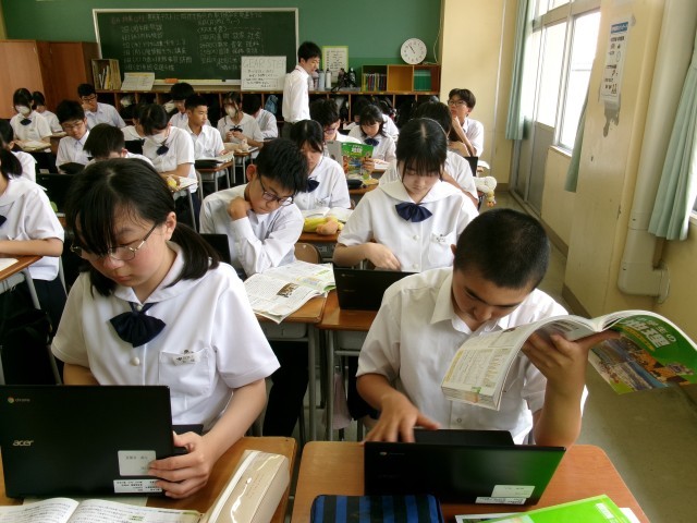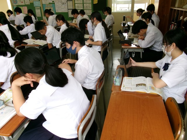 社会の授業の様子です。一人一台の端末、教科書、資料集を使って調べた内容をまとめていました。