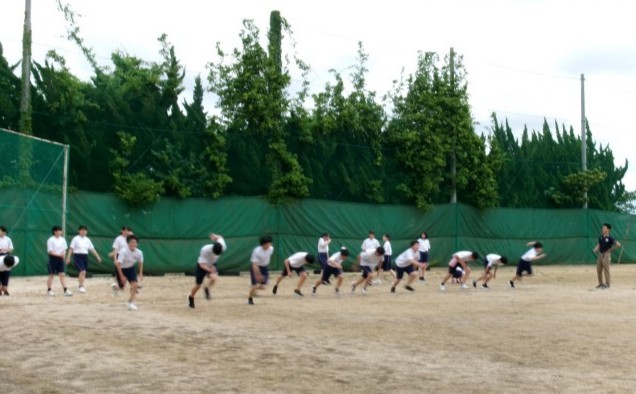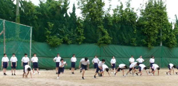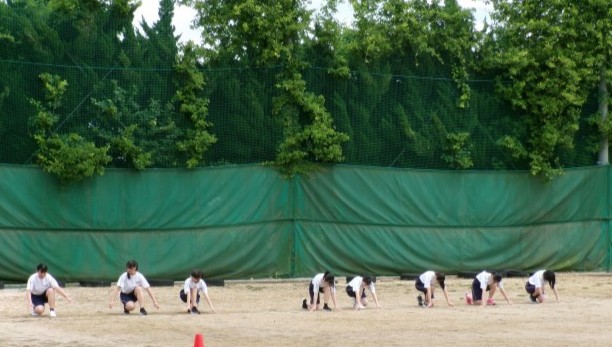 保健体育科の授業の様子です。クラウチングスタートの練習中でした。「セット」で静止することが、難しいようです。よいスタートダッシュに結びつくよう練習してください。