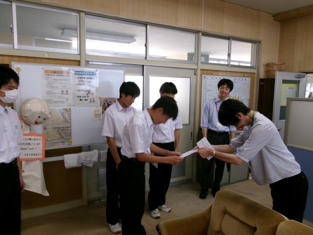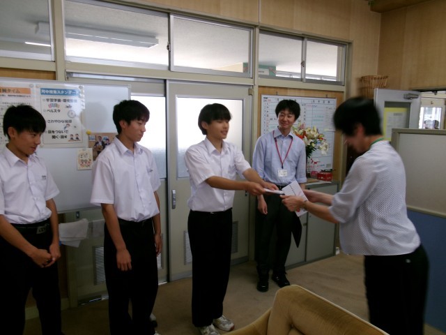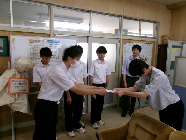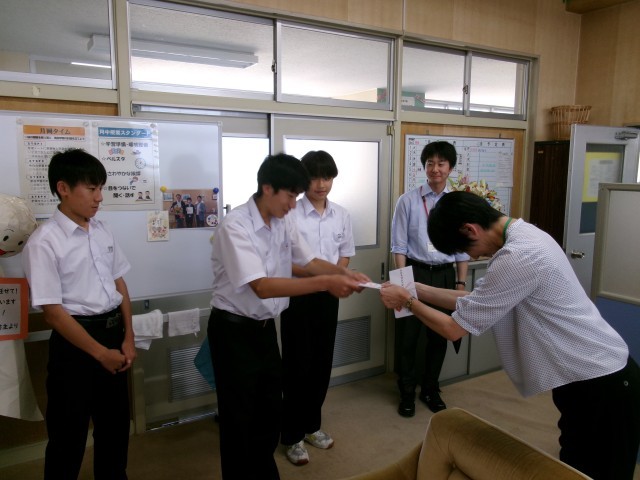 7月5日・6日に行われる富山県中学校総合選手権大会に出場する陸上部の4名に激励金を渡しました。選手からは、自己ベストが出せるよう頑張ります、練習の成果を出しますなどの決意表明がありました。大会まで2週間あまり!グッドコンディションで臨んでほしいと思います。頑張れ、月中生!