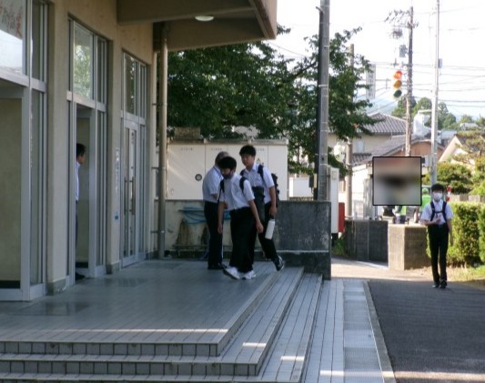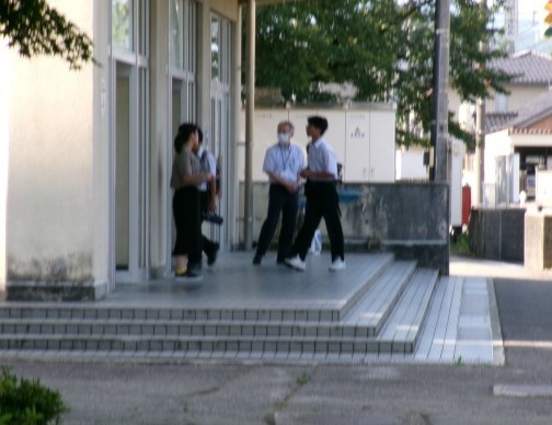 生徒玄関前は、午前中日陰になります。太陽の光を浴びて登校してきた生徒には、ちょっと涼しく感じる場所になります。