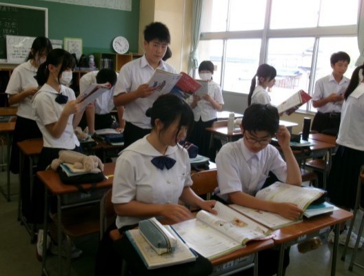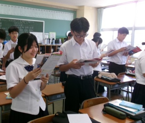 英語の授業の様子です。ペアで音読練習中でした。音読終了のペアから座っていきます。みんな、大きい声で音読できていました。