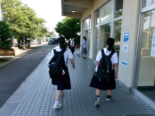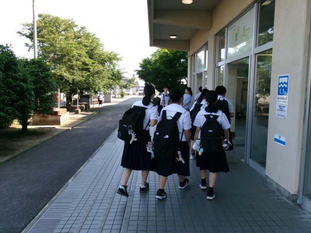 登校の様子です。玄関前の日陰で、「すずしーい!」と言っている生徒がいました。今日は、金曜日、今週ラスト1日頑張ろう!