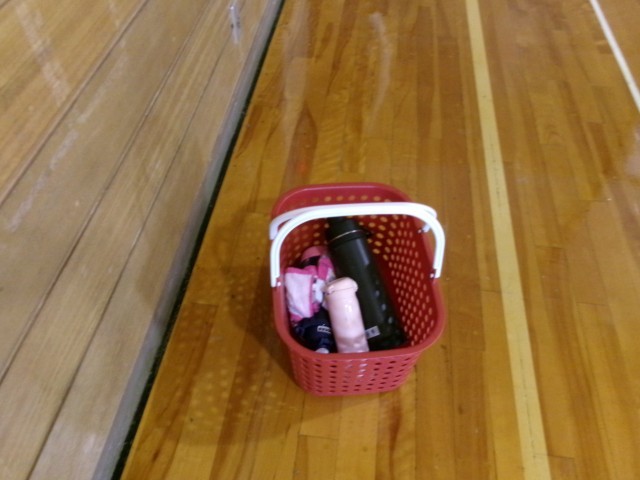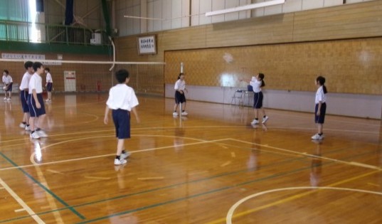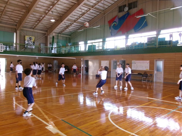 保険体育の授業の様子です。男女混合チームでパス練習をしていました。水筒は、グループごとのかごに入れてあり、練習場所の近くに置いてありました。グッドアイディアです!