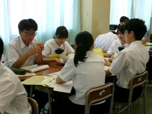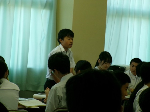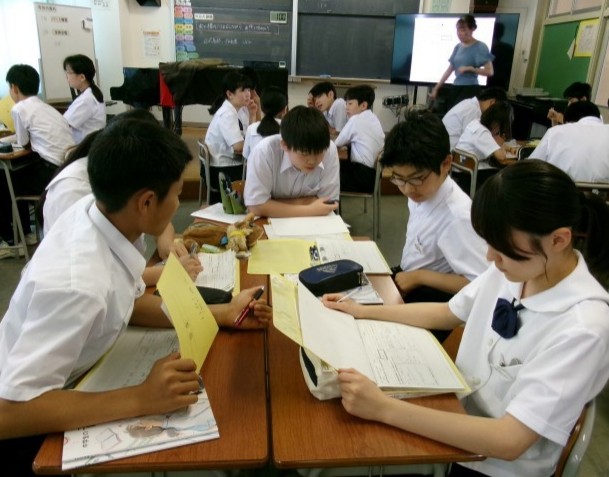 音楽の授業の様子です。鑑賞した後に、曲の特徴についてまとめていました。3枚目の写真は、班の代表が、発表しているところです。