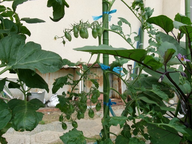 中庭のミニトマトは、実が連なってきています。はやく赤くならないかと楽しみです。