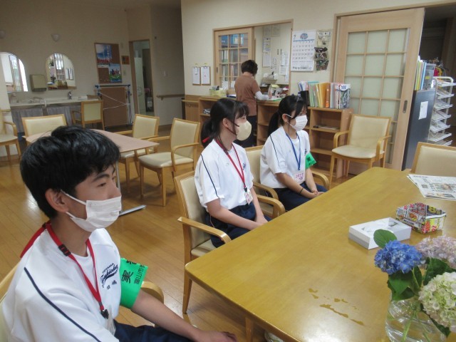 7月1日(火)「社会に学ぶ『14歳の挑戦』」その3 公開日 2025/07/01 更新日 2025/07/01 学び合い認め合う学習 利用者のみなさんのお話を聞いたり、話したりしています。写真 デイサービスやまゆり