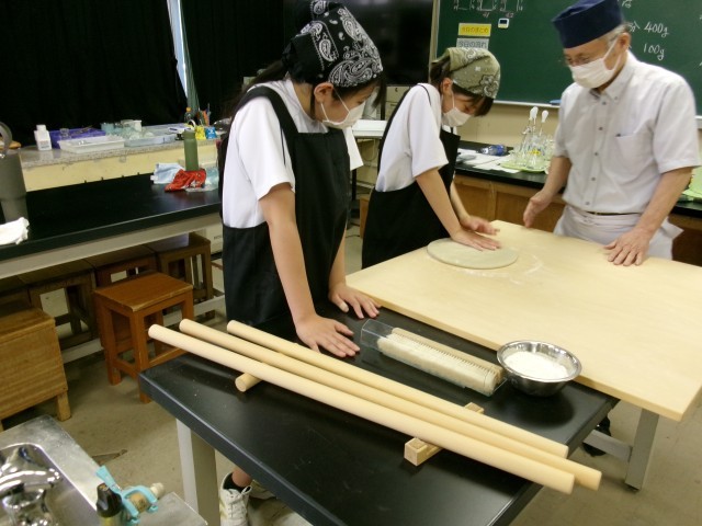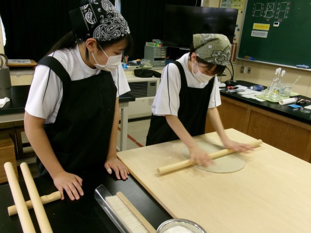 今日も、そば打ち体験を行っています。今日は、担任の先生も挑戦中!結構、力仕事なんですね。