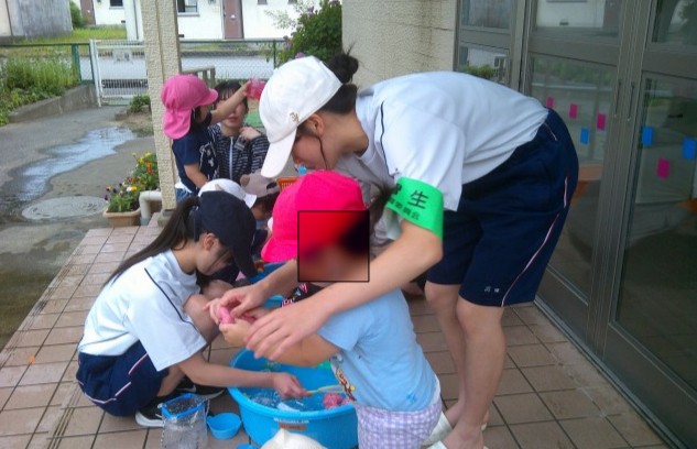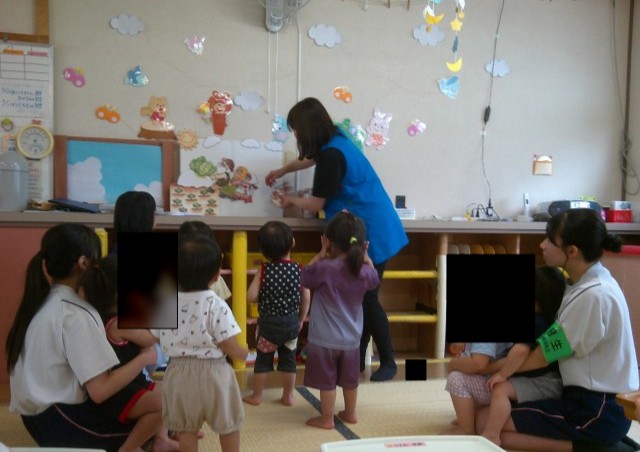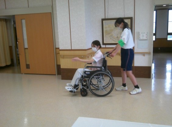 病院では、車いすの押し方を習っていました。この前に、自分が車いすに乗り、職員の方に押してもらい交代したところです。患者さんが恐怖心を抱かないよう工夫があるのですね。保育所では、お姉ちゃん先生として大活躍!一緒に遊びながらも、安全面にも気を配っています。笑顔が素敵です。