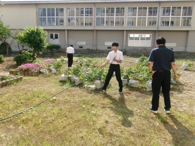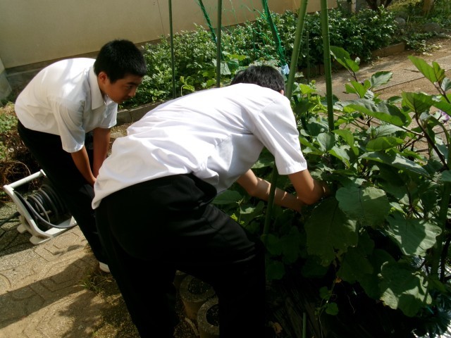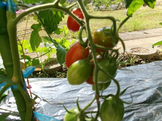 ホースにたまっていた水がお湯のように温かかったです。冷たくなるまでまって、水やりをしてくれました。トマトとナスも収穫しました。太陽の光を充分浴びて、美味しそうになりました。