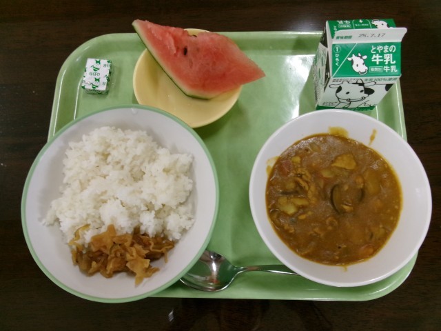 夏野菜カレーということで、かぼちゃ、ピーマン、ナス、トマト入りです。夏野菜には水分やカリウムが多く、熱中症予防につながるだけでなく、色とりどりで食欲を刺激する効果があり、ビタミンが身体の調子を整えてくれます。いいことだらけの夏野菜、旬の野菜を家庭でも取り入れてみてください!