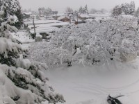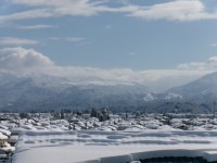 家々の屋根が雪の帽子を被っているように見えます。青空になってきて、雪解けが始まり...