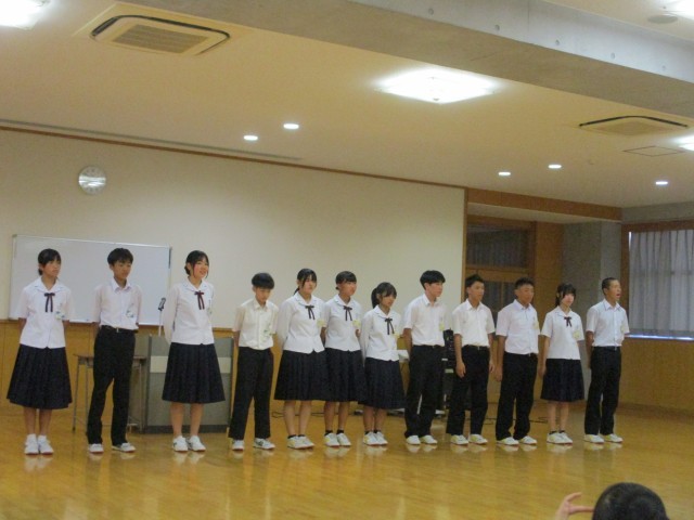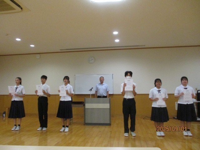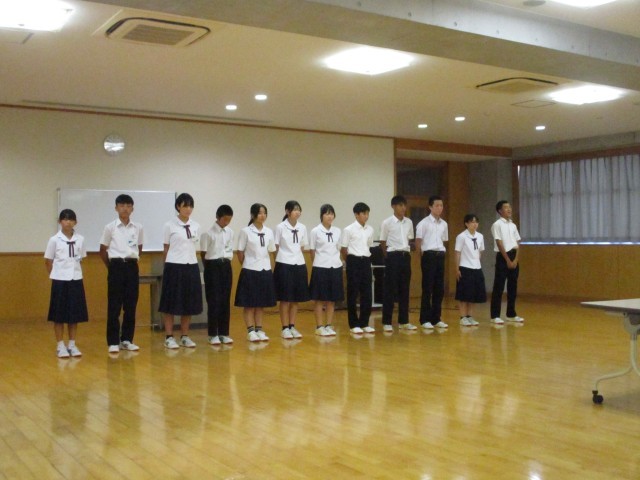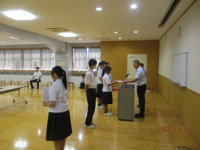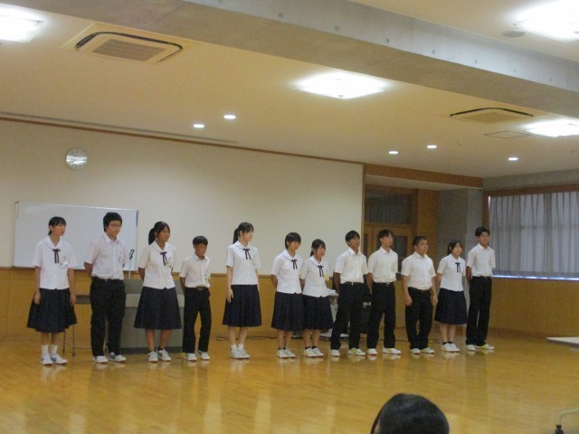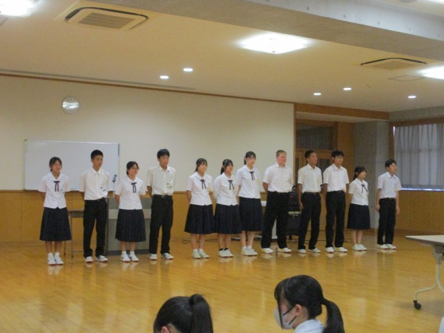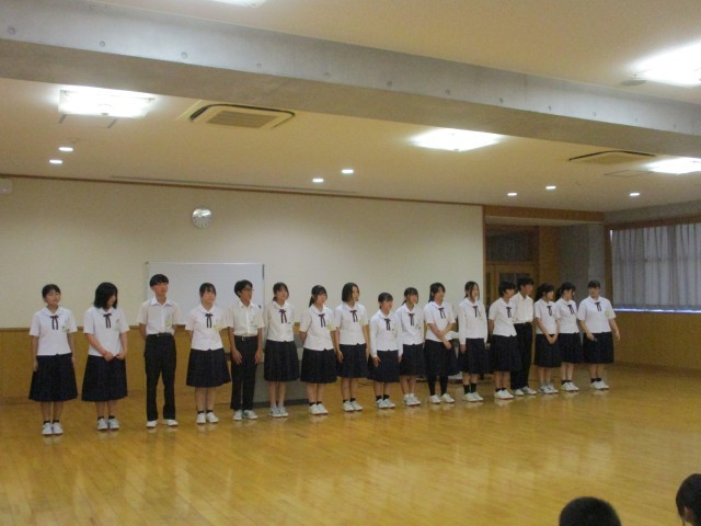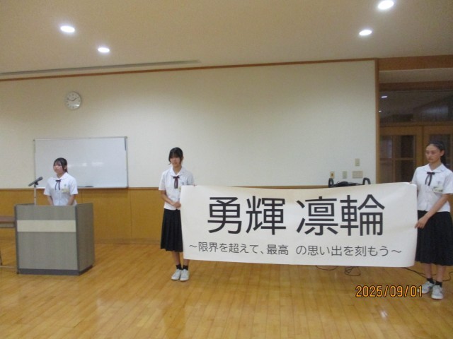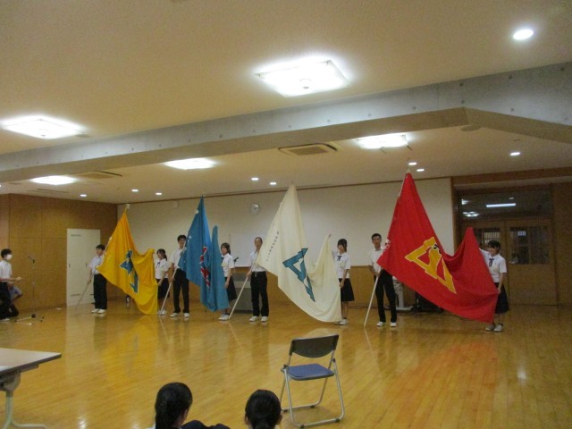 5時間目に体育大会の結団式を行いました。気温が高いため、オンラインでの結団式になりました。実行委員会からスローガン発表があり、各団リーダーとデコレーション係の紹介、そして団旗の受け渡しが行われました。最後に校長先生から激励の言葉をいただき、士気を高めていました。