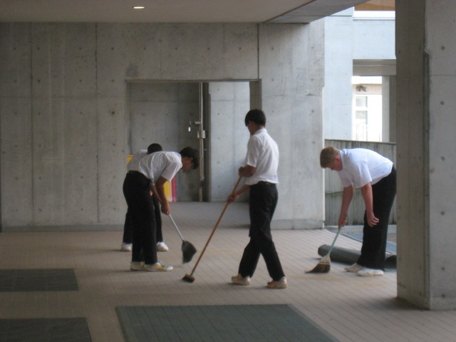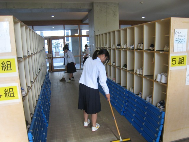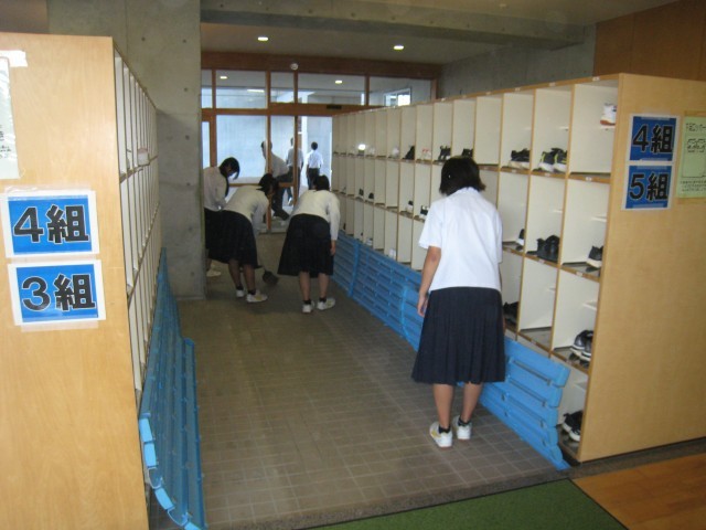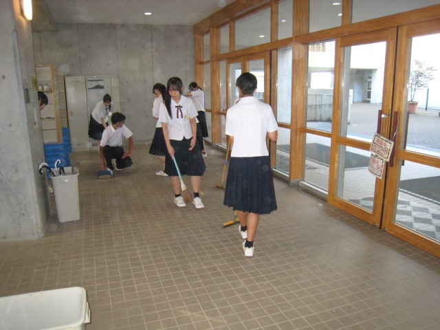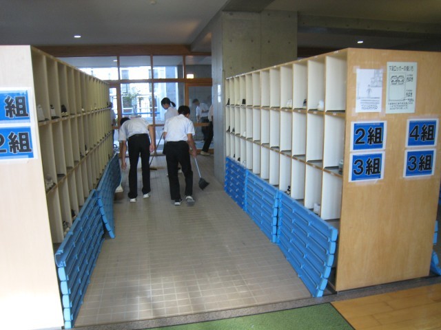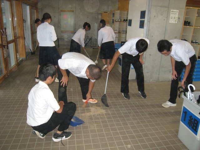 昨日の体育大会で、シューズの裏に付いた砂が玄関にたくさん入っていたので、生徒が登校した後に体育大会団リーダーが清掃を行いました。