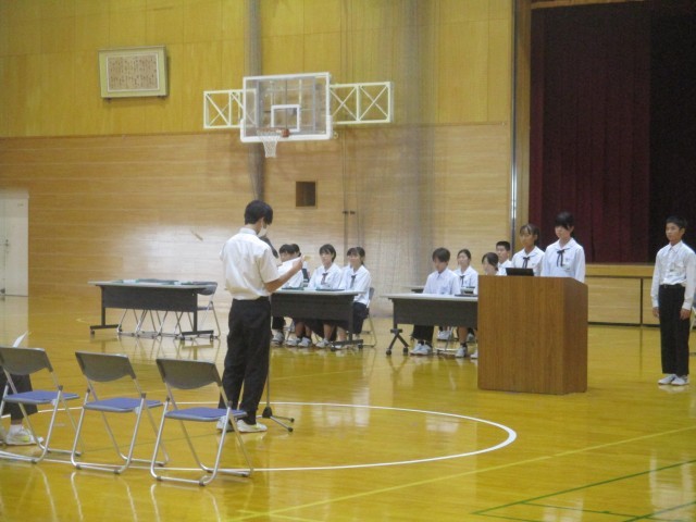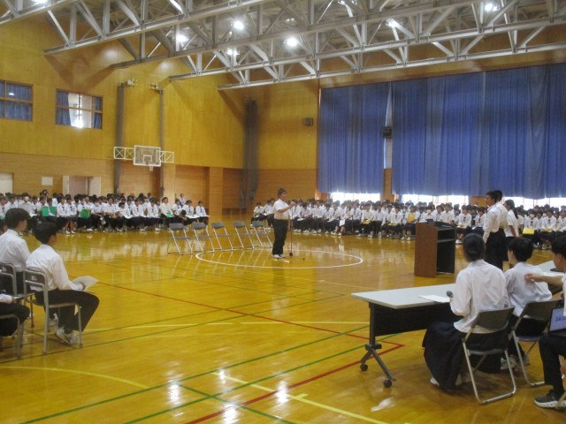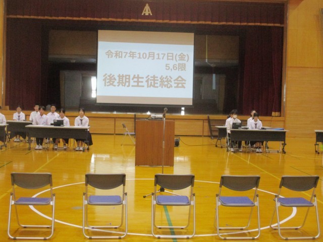 本日、5限目と6限目に後期生徒総会を開催いたしました。生徒会執行部および各委員会の代表が、後期に取り組む活動内容や目標について発表を行いました。校長先生からは、前期の反省を踏まえながら、これまでの良い取り組みは引き続き継続しつつ、新たな改革にも積極的にチャレンジしてほしいとのお話がありました。また、「呉羽中学校の歴史に新たな1ページを刻んでいきましょう」と励ましの言葉をいただきました。