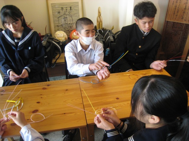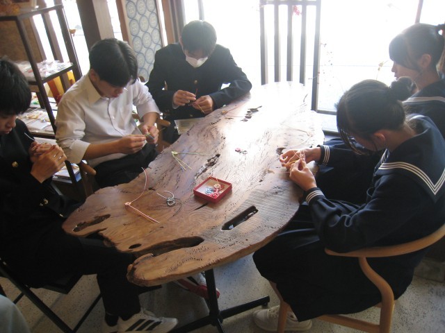 生徒は細い紐を丁寧に結びながら、ストラップや飾りを作りました。