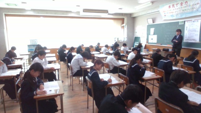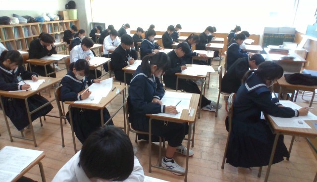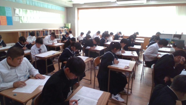 今日は県中教研学力調査1日目です。英語・国語・理科の順でテストが行われました。集中してテストに挑戦しています!