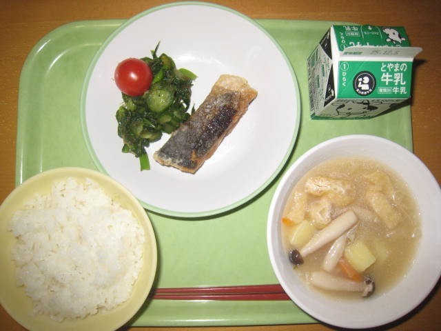 今日は「学校給食とやまの日」で、富山市の港にあがったふくらぎや、富山県で消費量が多いととろ昆布、大沢野地域でとれた小松菜、富山県内でとれただいこん等の野菜が活用されたメニューでした。「地産地消」の大切さや、地域の産業や食文化への理解を深める考える機会になったと思います。