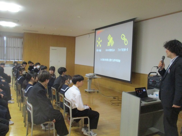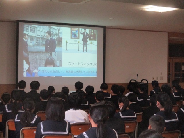 本日、1学年で「SNSの正しい利用」についての集会を行いました。