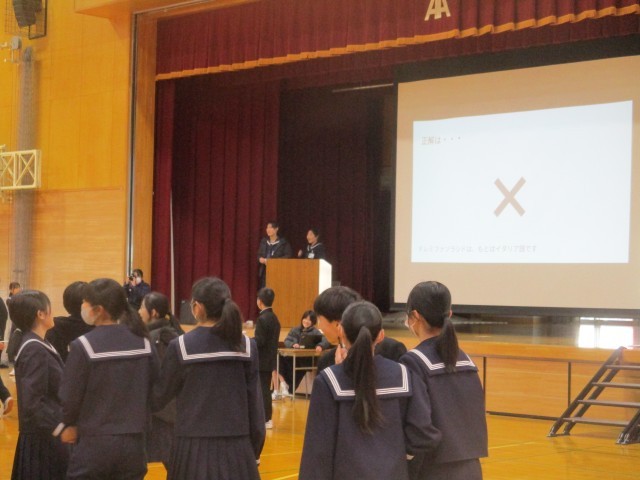 クイズ大会では、●×形式の問題を20問近く準備していましたが、4問目で全員が不正解となり、参加者がいなくなるという予想外の展開になりました。しかし、敗者復活制を取り入れるなど、運営を担当した生徒たちが工夫を凝らし、最後まで楽しくクイズ大会を進行してくれました。