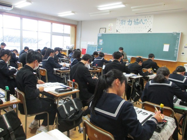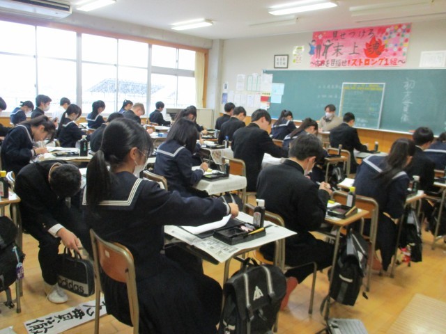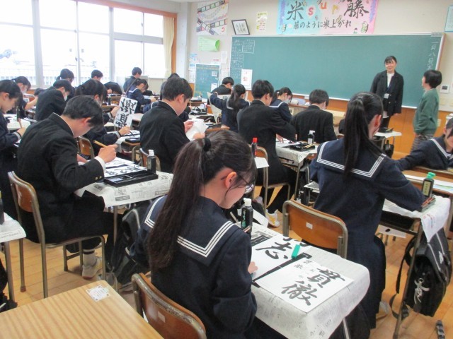 始業式の後、中学校では最後となる書き初め大会を行いました。今年の題目は「初志貫徹」でした。練習の成果を出せるよう、集中して真剣に書いていました。