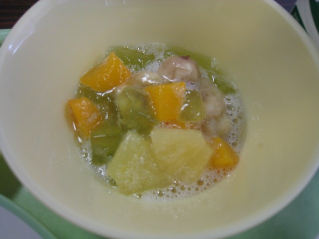 フルーツゼリーミックスには、パインアップル、桃、バナナ、3種類のフルーツが入っています。