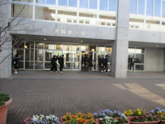 春の青空のもと、2、3年生が登校してきました。今日は、学年集会や明日の入学式の準備を行います。
