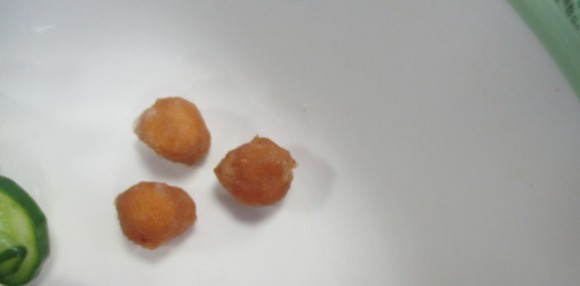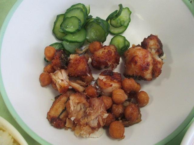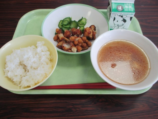 新年度初給食です。今日は、ひよこ豆が出ています。豆の形が、ひよこの頭(くちばしのような突起がある)に似ているのが、名前の由来だそうです。さらに、「スーパーフード」と言われるほど栄養価が高い豆です。初給食にぴったりですね。久しぶりの給食がうれしく、おいしくいただきました。
