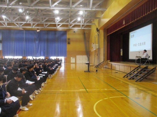 本日、交通安全教室を実施しました。本校の教員がクイズを交えながら、安全に登下校するためのポイントを紹介しました。クイズの答えを考える場面では、生徒たちは楽しみながら主体的に交通ルールへの理解を深めている様子でした。