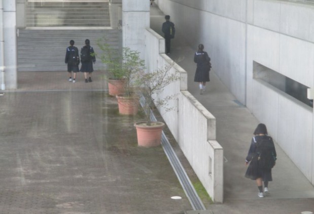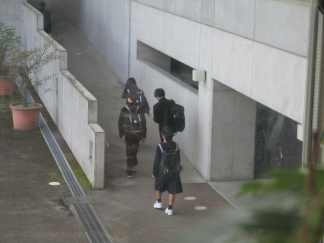 生徒玄関前のパンジーの花がきれいに咲いています。生徒の登校の様子です。