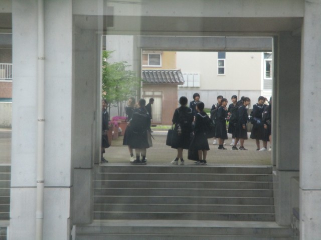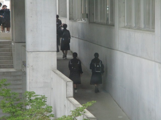学校の周りには、色とりどりの花が咲いています。そんな中を通って、生徒たちが登校してきました。