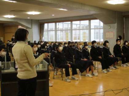 期末考査が終わった今日の午後、富山大学産科婦人科学教室より先生をお迎えし、性教育講座を行いました。昨年もお話しいただきましたが、今回は「体と心」「望まない妊娠を避けるため」「人とのつきあい方」等についてお話しいただきました。