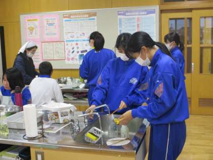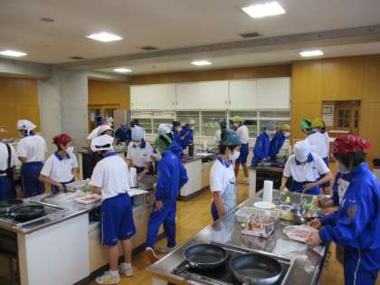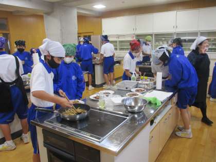 今週は、4組を皮切りに「豚の生姜焼きともやし炒め」の実習が続きます。班で協力してみんなでいきいきと、時間内で手早く作業を進め、試食、片付けまで要領よく進めました。