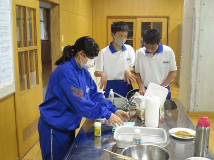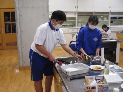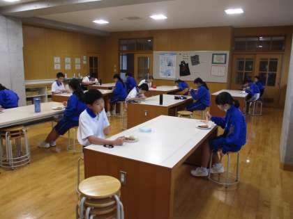 調理後は、密にならないように2教室に分かれて試食しました。コロナ禍で、例年にない配慮を要する中で、適切に対応しながら実施しています。