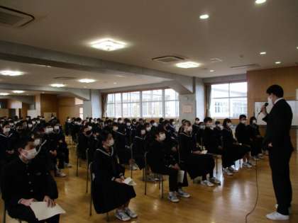 終業式を明後日に控え、学年集会を行いました。学年生徒指導からは「『命』を大切に」とコロナ禍で、一人一人が考えて行動しなければならないことや、時間に少し余裕がある冬期休業中に「あの時やっておいて良かった」と思える行動をしてほしいと話しました。